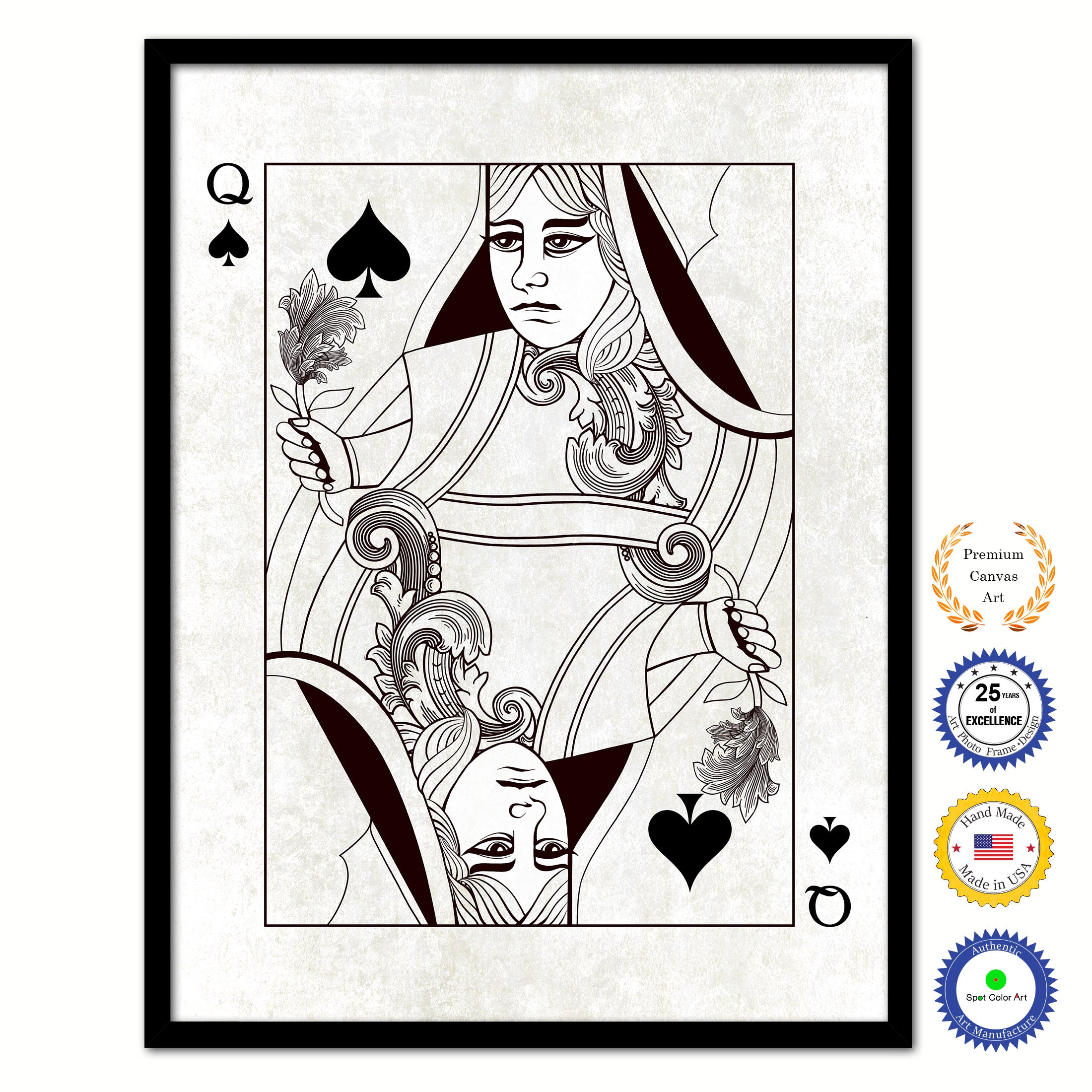 Queen Spades Poker Decks of Vintage Cards Print on Canvas Black Custom Framed